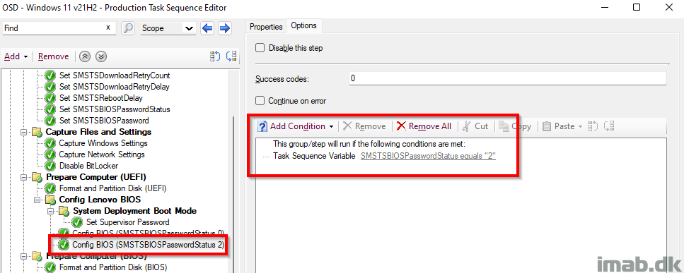 This step also queries the SMSTSBIOSPasswordStatus, making sure the step is only run, if a supervisor password is present.