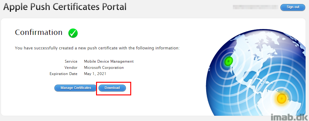 From here, download the renewed certificate using the Download button as shown below. This will be a file named MDM_ Microsoft Corporation_Certificate.pem.