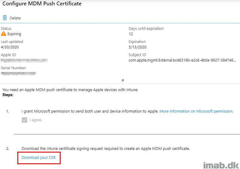 - On the Configure MDM Push certificate blade, notice that the days until expiration is shown here as well. Proceed the renewal with Download your CSR. This will begin a download of a file named: IntuneCSR.csr.
