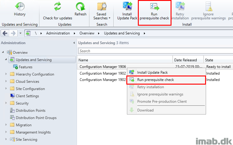 Back in the Configuration Manager Console in the Updates and Servicing note, it’s time to run the prerequisite check. Do so either in the ribbon or by right clicking on the Configuration Manager 1906 update as shown below: