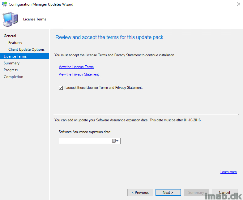 - Accept the license terms. Filling out the SA expiration date is optional. I didn’t fill it out. This is the final step before getting the mandatory summary